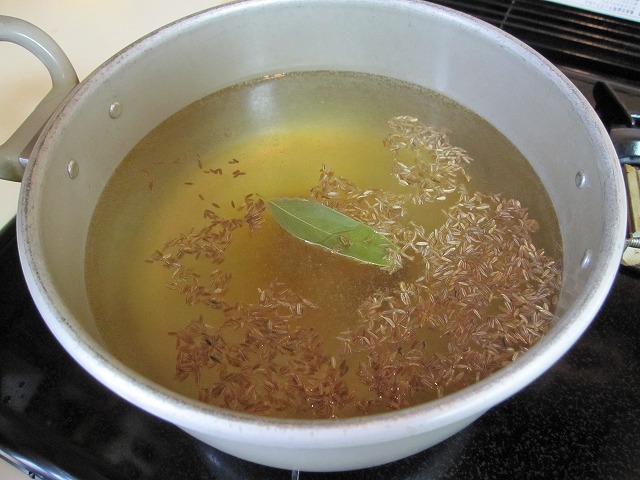 コンソメブイヨンのスープに、クミンシード・ローリエを加えて香り付けします☆