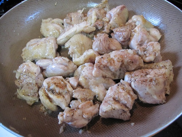 お次に油を敷いたフライパンで、微塵切りにしたニンニクの香りを出して、鳥モモ肉を強火でソテーします☆
