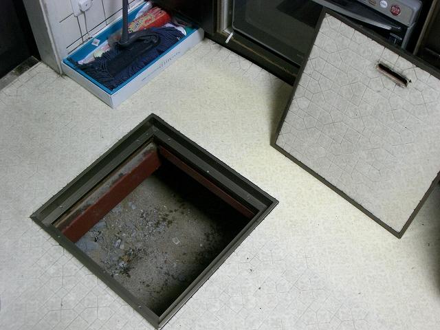 キッチンの隅、床下収納が設置される予定だったであろうスペースがあります。