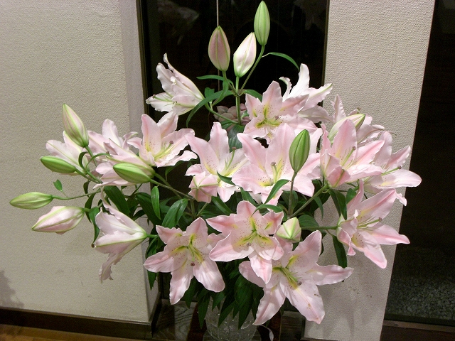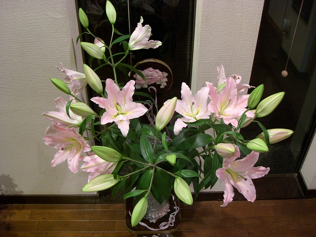 母の日に贈った百合の蕾が次々と開花してます☆突然「パッ」と花開くらしいです…"母いわく"ですが☆あっ、こんな事も言ってました(*゚▽゚)花粉で花が汚れないように開花したらスグに雄蕊(おしべ)を取るとイイそうです☆ちなみに花言葉は、威厳・純潔・無垢☆